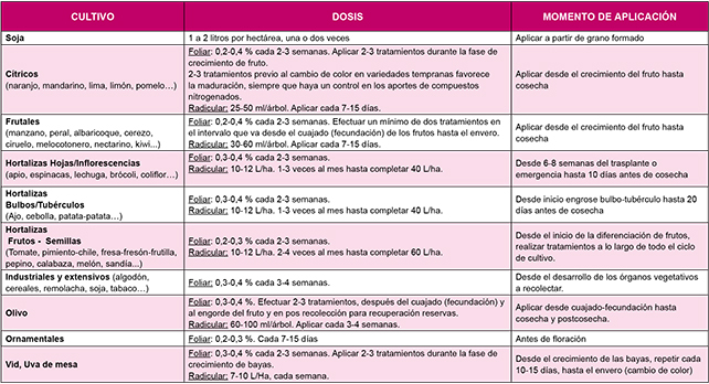 Descripción del producto: Bionutiente en base a aminoácidos y potasio de rápida asimilación. Aplicación foliar en hortifruticultura y en cultivos extensivo para grano. Modo de empleo: En soja a partir de floración para mejorar llenado de granos. En frutales de hoja caduca y en cí­tricos mejora calidad, color, conservación y sabor de la fruta. En hortalizas de fruto (tomate, pimiento, pepino, berenjena, sandí­a, frutilla) incrementa calidad y resistencia poscosecha.