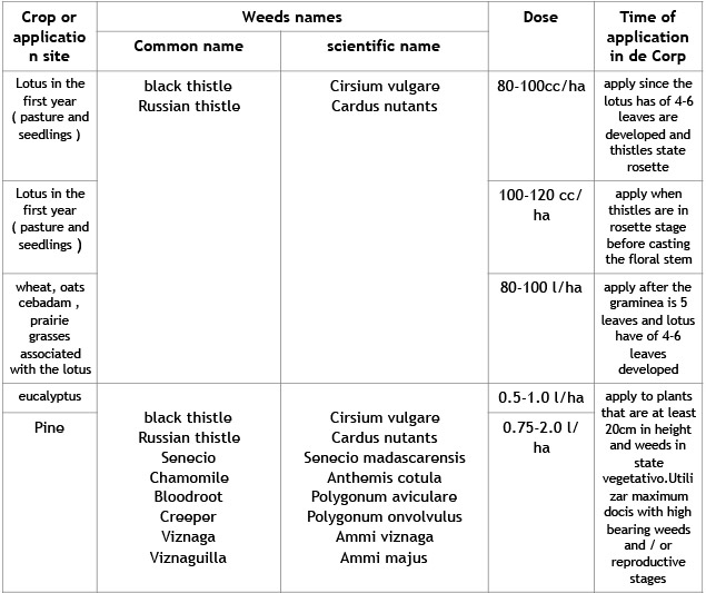 Characteristics of the product: Clopyralex is a systemic post- emergent herbicide, hormone action , auxin mimetic that is absorbed by foliar and root path of sensitive weeds, indicated for the control of broadleaf weeds in pastures and lotus seed, wheat, barley , oats, forage grasses and forest plantations of eucalyptus and pine trees. Leaves no residue in the soil for long periods, being suitable for use in rotations where legumes , sunflower, soy , potatoes are included, etc.