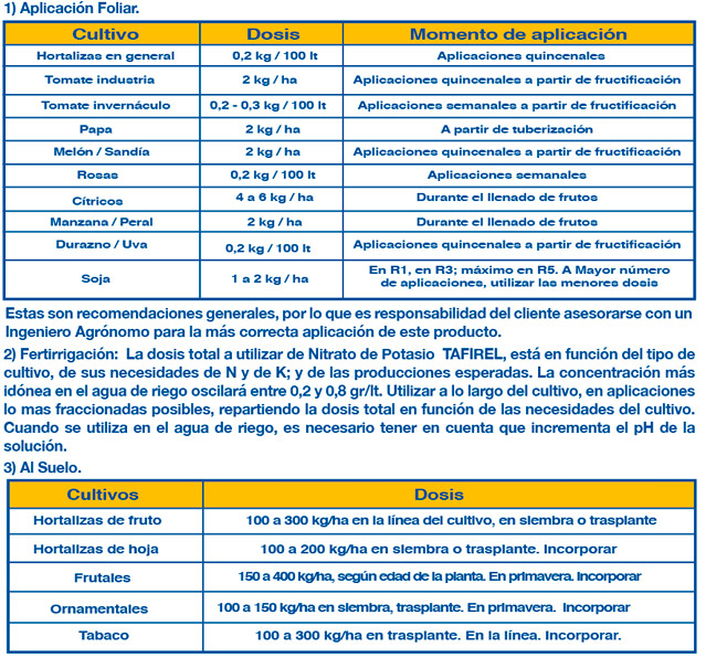 Descripción del producto: El Nitrato de Potasio TAFIREL es un fertilizante mixto, NK, que puede ser utilizado tanto en aplicación foliar como en fertirrigación, así­ como para aplicación directa al suelo, ya que no sufre pérdidas por volatilización. El Nitrógeno (N): Es un nutriente esencial para el crecimiento de las plantas, es parte constitutiva de cada célula viva. En las plantas el nitrógeno es necesario para la sí­ntesis de clorofila y como parte de la molécula de clorofila está involucrado en el proceso de fotosí­ntesis. El Nitrógeno es parte esencial de los aminoácidos y por lo tanto es determinante para el incremento en el contenido de proteí­nas de las plantas. Una planta deficiente en nitrógeno no puede hacer un uso eficiente de la luz solar por lo que se ve afectada su capacidad de foto sintetizar y en consecuencia su capacidad de aprovechamiento y absorción de nutrientes, limitando con esto su capacidad de crecimiento. El Potasio (K): Es fundamental en el proceso de fotosí­ntesis. Deficiencias de K reducen la fotosí­ntesis e incrementan la respiración celular, resultando en una reducción de la acumulación de carbohidratos y por lo tanto un efecto adverso en el crecimiento y producción de las plantas. Es esencial para la sí­ntesis de proteí­nas, y proporciona a la planta mayor resistencia al ataque de enfermedades y mayor resistencia a las heladas. El K, es determinante en la formación de frutos y llenado de granos. Por último, una planta bien nutrida de K tiene mayor capacidad de soportar situaciones de stress por falta de agua ya que la disponibilidad de este, afecta la capacidad de apertura y cierre de estomas. El Nitrato de Potasio: Es la fuente más usada de Potasio en fertirrigación, dado su gran solubilidad en agua, su altí­sima concentración de K2O y la ausencia de Cloro, lo que le confiere ventajas en cultivos tales como tabaco, cí­tricos etc. Otra de las ventajas del Nitrato de Potasio TAFIREL, es su aporte de nitrato de efecto inmediato en los cultivos