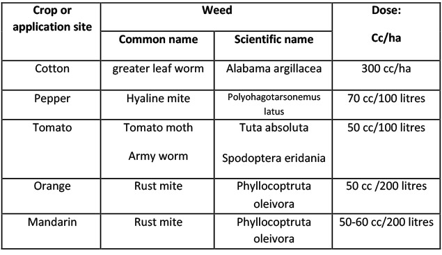 Characteristics of the product: CLORFENAX is an insecticide from the group of pyrroles with control of mites and moths. It acts by ingestion turning to its active form within the insect and mite, inhibiting the process of power generation in susceptible pests by uncoupling of oxidative phosphorylation in mitochondria. Quick action, while controlling the larvae feed on the foliage. It is selective to beneficial insects by acting on the insects that feed on the crop in question. It has translaminar activity that allows it to move in the sheet. It is suitable for resistance management because it has a different mode of action and has no cross-resistance with other chemical groups. Controls the white mite, mite yolk citrus, rust mite of citrus, European red mite and tomato moth in tomato, citrus, and cotton.