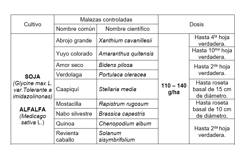 Descripción del producto: Herbicida sistémico selectivo de acción residual, interrumpe la síntesis de proteínas. Se absorbe por raíces y follaje. Se debe de aplicar sobre malezas en activo crecimiento, puede ocasionar amarillamiento de la soja tratada entre 1° y 3° foliolo no causando disminución de su rendimiento. Puede ser aplicado en pre siembra 70 g/ha y post emergencia temprana 70 g/ha. Posee control residual de malezas susceptibles que germinen después de la aplicación.
