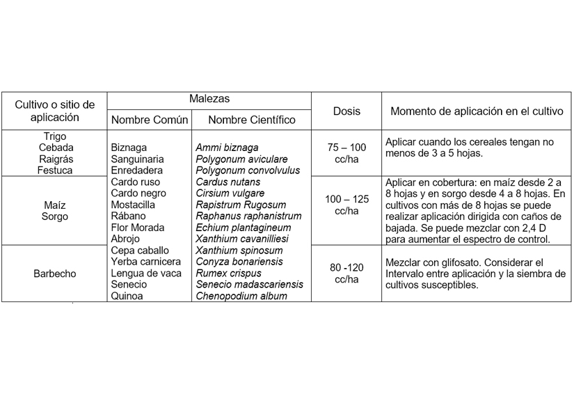 Descripción del producto: Herbicida sistémico, de acción hormonal. Controla malezas de hoja ancha, anuales y perennes. Tiene acción hormonal y es selectivo para trigo, cebada, colza, maíz y sorgo. Es absorbido por el follaje, tallo y raíces de las malezas.
